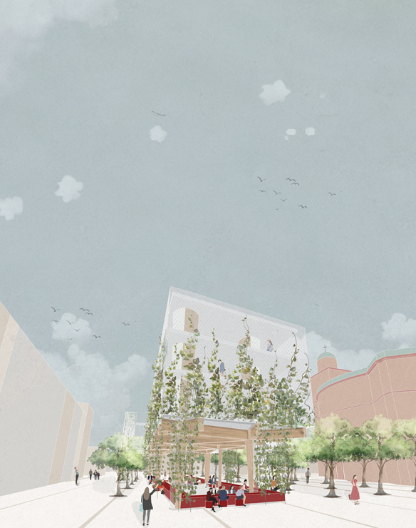 In den oberen Ebenen, dem „Kronenbereich des Baumhains“, sind die Nutzungen für das spezieller interessierte Publikum untergebracht – Flächen für Veranstaltungen, Workshops und Ausstellungen, sowie die Bibliothek.